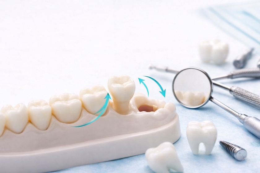 Uno de los efectos más frecuentes es el desplazamiento de los dientes adyacentes hacia el espacio vacío. Al perder el punto de contacto que tenían con la pieza ausente, estosesos dientes pueden inclinarse progresivamente.